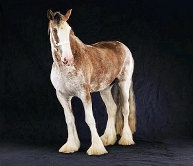 The Clydesdale is a breed of draught horse derived from the farm horses of Clydesdale, Scotland, and named after that region. Although originally one of the smaller breeds of draught horses, it is now a tall breed. Often bay in color, they show significant white markings due to the presence of sabino genetics. The breed was originally used for agriculture and haulage, and is still used for draught purposes today. The Budweiser Clydesdalesare some of the most famous Clydesdales, and other members of the breed are used as drum horses by the British Household Cavalry. They have also been used to create and improve other draught breeds.